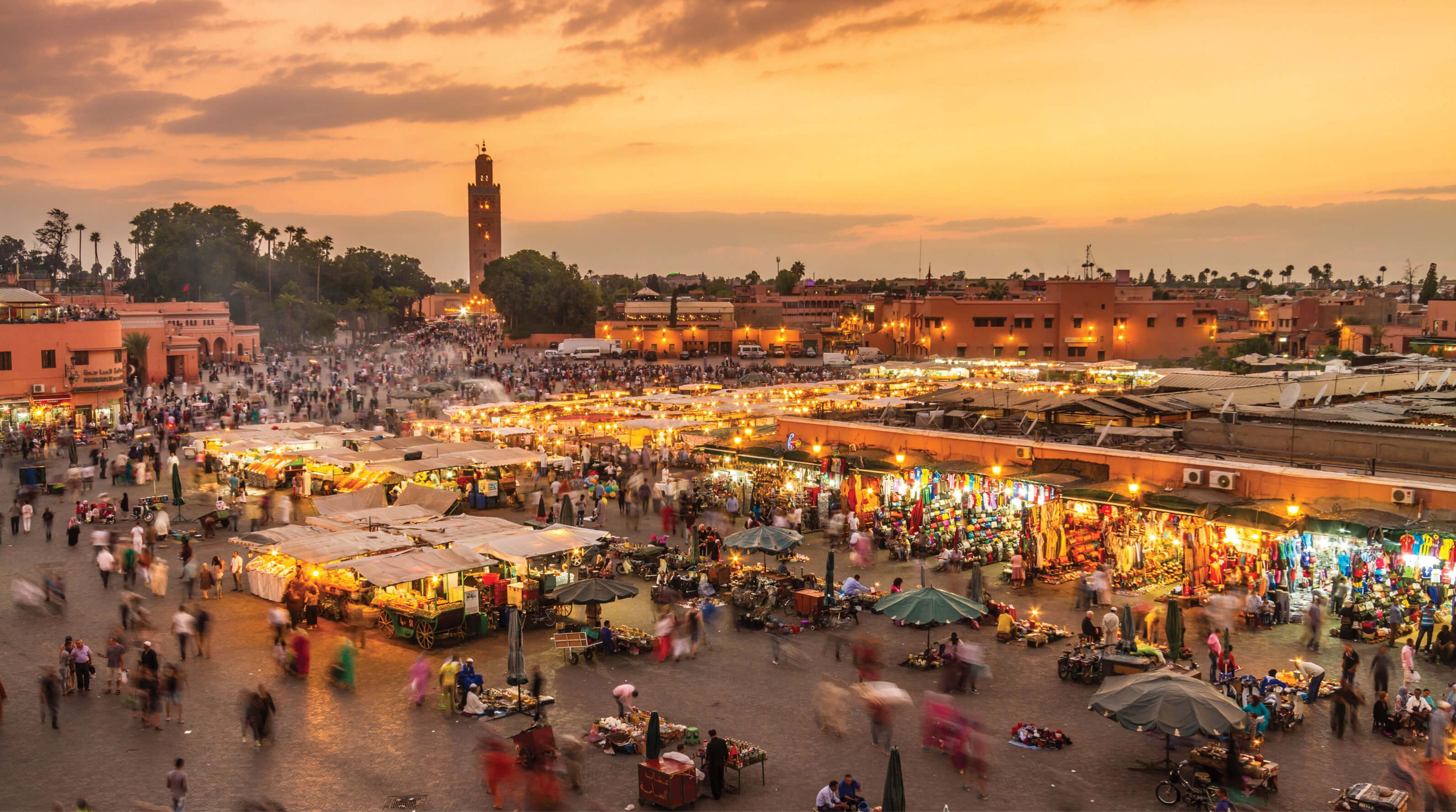 Conocida como la ciudad roja por el color de sus casas, Marrakech es una de las antiguas capitales del Imperio Islámico. Allí encontraremos los más grandes y interesantes souqs (mercados) del país. Es fácil perderse en el tiempo y espacio en esta ciudad mítica. Al caminar por la plaza Djeema El Fna, Patrimonio UNESCO, y enseguida por los callejones, viajamos a algún lugar en el tiempo donde encantadores de serpientes, bereberes vendiendo especias, artesanos pintando cerámica o cosiendo zapatos se mezclan a ese ambiente mágico y magnífco. Por otro lado, la parte nueva de la ciudad es contemporánea, con cafés, heladerías, tiendas de ropa ultra modernas y otros objetos de diseño, además de bares y restaurantes animados.